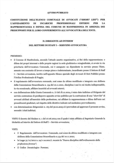 “La creazione di una short list di avvocati è un passo importante verso una gestione più trasparente ed efficiente degli incarichi legali del Comune”, commenta il sindaco di Manfredonia Domenico La Marca – Sindaco.
