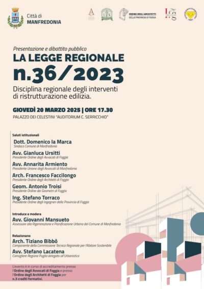 L’evento è stato promosso dal Comune di Manfredonia, con il patrocinio dell’Ordine degli Avvocati, degli Architetti, degli Ingegneri e dei Geometri, al fine di comunicare le novità della legge regionale n. 36/2023 in materia di ristrutturazione edilizia in sostituzione del Piano Casa regionale.