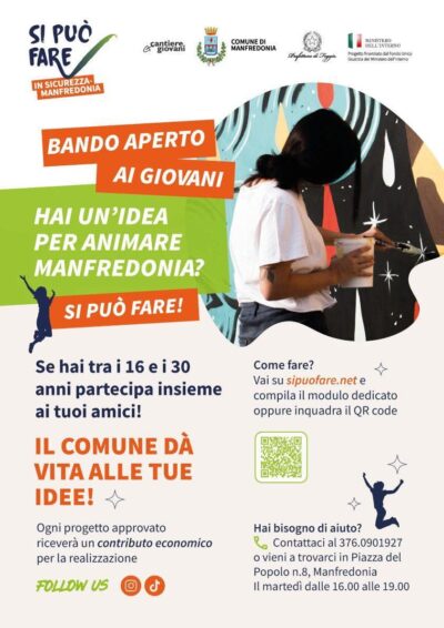 Martedì 8 aprile 2025 alle ore 16:00, i gruppi giovanili selezionati alla call di idee “Si Può Fare Manfredonia” si presenteranno nella sala consiliare del Comune. Sono stati approvati 9 progetti coinvolgendo un totale di 106 ragazze e ragazzi del territorio. “Una nuova occasione per favorire la partecipazione dei giovani cittadini, il dialogo con le Istituzioni, aumentare il loro senso di appartenenza e cooperazione per la comunità” dichiara il Sindaco Domenico La Marca.