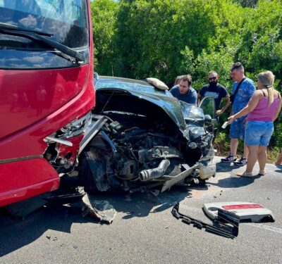 SCONTRO FRONTALE TRA BUS E AUTO, IMPATTO INEVITABILE