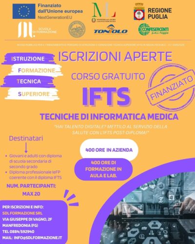 SDL FORMAZIONE di Manfredonia apre le iscrizioni al nuovo corso IFTS – Tecniche di Informatica Medica, un percorso post-diploma della durata di un anno che unisce formazione teorica, laboratori pratici e stage in azienda. Si tratta di un’opportunità unica per i giovani diplomati pugliesi che vogliono specializzarsi in un settore in continua crescita: l’integrazione tra tecnologia e sanità.