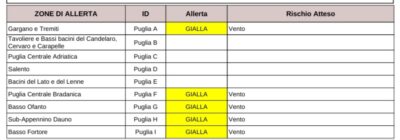 Il dipartimento della protezione civile ha emesso per la Puglia l’allerta on validità dalle 13 per venticinque ore. Si fa riferimento a “venti: