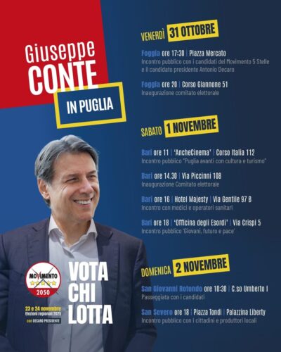 Dal 31 ottobre al 2 novembre il presidente del Movimento 5 Stelle, Giuseppe Conte, sarà in Puglia per una serie di eventi e incontri sul territori