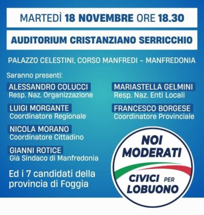– L’ex ministro Mariastella Gelmini sarà a Manfredonia per sostenere il candidato presidente della Regione Puglia Luigi Lobuono. La responsabile nazionale enti locali di Noi Moderati è l’ospite d’onore di un incontro pubblico che si terrà martedì 18 novembre alle ore 18:30 presso l’Auditorium ‘Cristanziano Serricchio’ di Palazzo Celestini, in corso Manfredi a Manfredonia. Relatori, oltre Gelmini, saranno l’on Alessandro Colucci, responsabile nazionale organizzazione dal partito di Maurizio Lupi, il segretario regionale Luigi Morgante, il segretario provinciale Francesco Borgese, il coordinatore cittadino di Manfredonia Nicola Morano e Gianni Rotice, già sindaco della città sipontina, oltre ai sette candidati della provincia di Foggia per la lista Noi Moderati – Civici per Lobuono. Mariastella Gelmini ha ricoperto l’incarico di Ministro dell’Istruzione, dell’Università e della Ricerca nel Governo Berlusconi IV (2008-2011) e Ministro per gli Affari Regionali e le Autonomie nel Governo Draghi (2021-2022). Attualmente fa parte del gruppo parlamentare Civici d’Italia-UDC-Noi Moderati. L’incontro è aperto al pubblico e rappresenta un momento fondamentale per illustrare la visione e le proposte del partito di Maurizio Lupi in vista delle prossime sfide politiche.