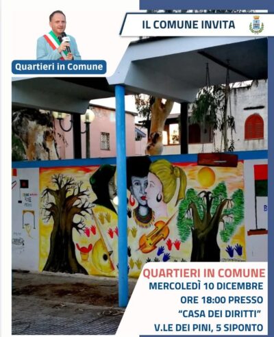 Prosegue il percorso di dialogo diretto tra Amministrazione e cittadini attraverso gli incontri “Quartieri in Comune”.Il prossimo appuntamento si terrà mercoledì 10 Dicembre, alle ore 18:00, presso la Casa dei Diritti, in Viale dei Pini 5 a Siponto.