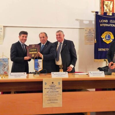 «Pur chiamato a svolgere l’attività di alto funzionario dello Stato Miche Di Bari è rimasto appassionatamente legato alle sue radici garganiche» – ha evidenziato il presidente del Lions di Manfredonia, Giuseppe Grasso aprendo la cerimonia svoltasi nell’auditorium “Vailati”, presenti, con un folto pubblico, il Governatore del Distretto 108 AB, Giordano Tortorelli, l’arcivescovo padre Franco Moscone, il sindaco di Manfredonia Domenico La Marca, il Past presidente dei Governatori, Leonardo Potenza, del presidente delle Circoscrizione A, Vincenzo Campagna.