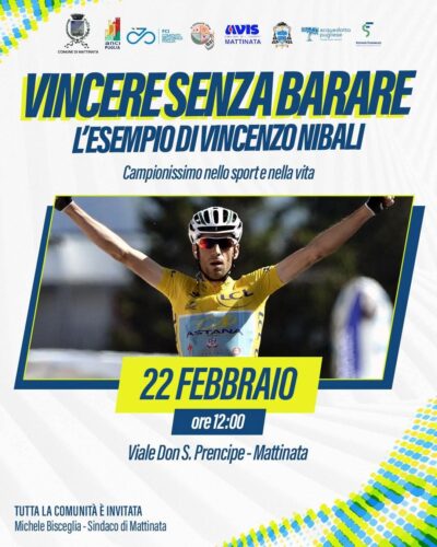 Domenica 22 febbraio alle ore 12.00 Vincenzo Nibali incontrerà i cittadini di Mattinata, tutti gli sportivi e gli appassionati di ciclismo del Gargano per un momento di Comunità da vivere tutti assieme.🤩Questo evento finalizza un progetto di educazione scolastica promosso dalla Federazione Ciclistica Italiana (Coordinamento Pugliese) e da AnciPuglia tenutosi con i ragazzi del nostro Istituto Comprensivo Scolastico che ha accolto con grande entusiasmo l’iniziativa.⭐️L’Amministrazione comunale è grata per la preziosa collaborazione alla locale sezione dell’AVIS, alla Parrocchia Santa Maria della Luce, all’Acquedotto Pugliese e alla Fondazione Fumarulo.🤝